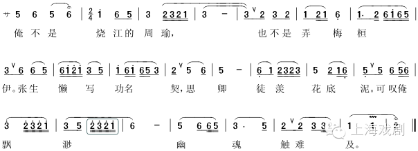 此牌是南曲套数首牌主曲,从所处套牌位置以及小生谦逊无奈之情绪尚未爆发到激昂时刻的发展过程看,板式恐不宜定为用于南北合套时的一眼板,则曲风未尽妥帖。末句“飘渺”两字反复了两次高音腔,起腔前的“可叹俺”一拍半四音连吐三字,虽然做了垫腔处理,已难容唱者做好气息酝酿的范了。