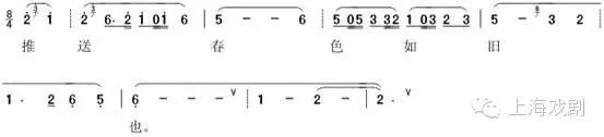 《春》剧的唱腔制作尝试着进行丰富和变化的探索,比如腔格灵活化、板位自由化、节奏情绪化、伴奏多样化与一牌多用性等。唱腔形成于辞、诉诸于谱、行走于腔、受制于节、载之于喉,曲师对板眼节拍、腔格口法的熟练运用使得本剧唱腔音乐有别于旧谱却留存了浓厚的昆腔曲风。