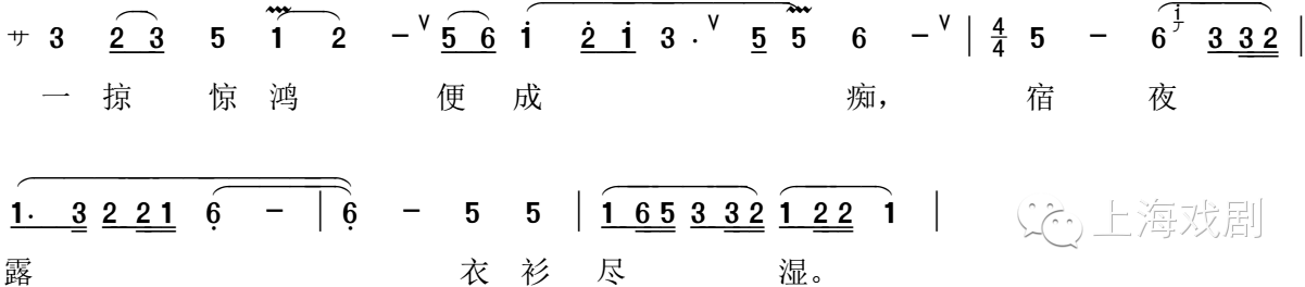 当然并不是每一次变换都是妥帖的。【好姐姐】一曲以闺门旦叫板起唱,紧接【园林好】,自宜上板。此牌第一句段应以二字句、二+二字句、三+四字句形成“二、四、七”三句式句段,乐段与之相对应。本剧所填只有两句“一掠惊鸿便成痴,宿夜露衣衫尽湿”,若将前一句断作两句后“一掠”单成一句则勉合句式,先不论字音与韵声当否,至少乐句段落能吻合曲牌。现谱作散唱首句,至“宿”字上板,并且头四字“一掠惊鸿”用清吟唱法,至“便”字才上笛,更将原词缺陷突出。若按常规带板起唱或散唱头两字后上板,则稍能“以腔救律”来补救,而“一掠惊鸿”的文辞含义也并不全靠散唱来体现。此牌首句两字单独形成一个乐句是曲牌特点,若都自由发挥则使用曲牌名称就失去了意义。