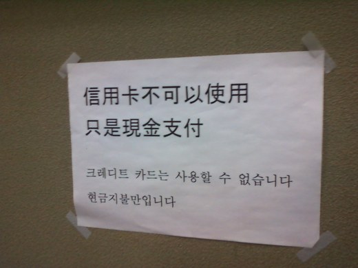 香港人的中文發音,的確聽起來是有一點點困難,但至少書寫和文法沒有太大的問題。而日本人的外文,可能是因為母語日語語系的獨特性,發音、書寫、文法都有蠻大的困難。我雖然完全不懂韓文,但可以想像這張貼示寫的韓文應該也有不少問題。日本人的英文,成笑話的故事也很多。shilky not silky.