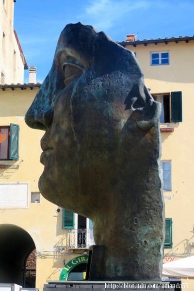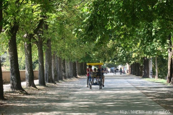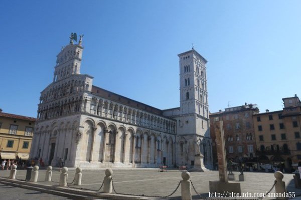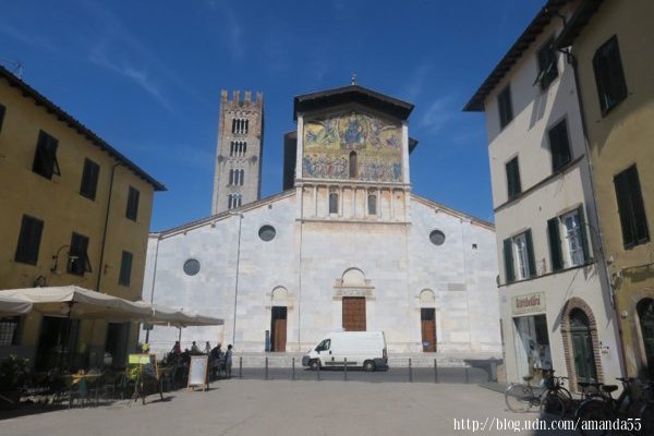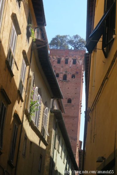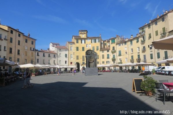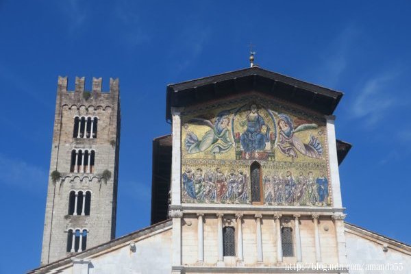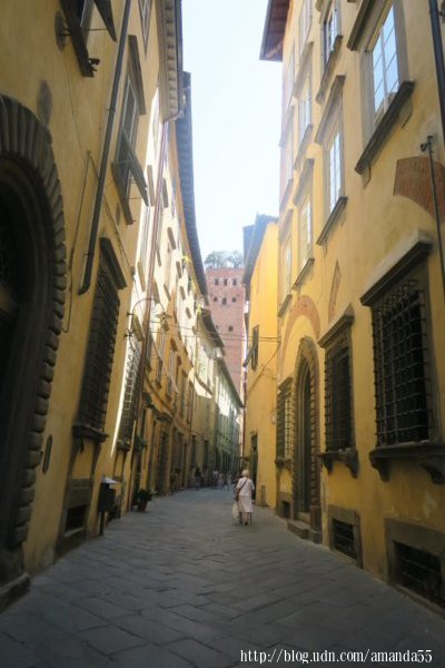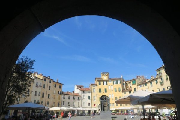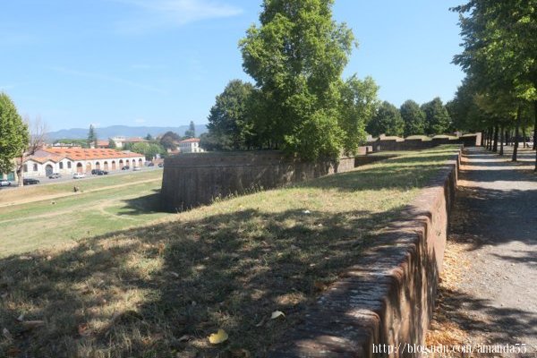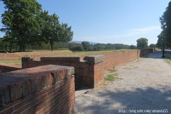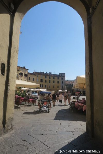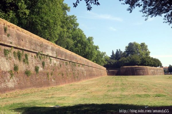 從古城西北方的聖多納托門(Saint Donato Gate),以順時針方向繞著城牆上的寬廣的步道向前走,草地與綠蔭伴著紅磚牆構成一幅怡人的景色,走到城牆北邊附近有一座聖弗雷迪亞諾聖殿(Basilica di San Frediano),聖殿外牆頂端的彩繪十分有趣,圓形競技場廣場(Piazza dell’ Anfiteatro)的原址是羅馬時代的競技場,現在已沉入地底,19世紀建築師將這裡設計成一座廣場,周圍的建築物環繞下烘托出廣場迷人的風采,驚豔之美是我對它的第一眼印象。