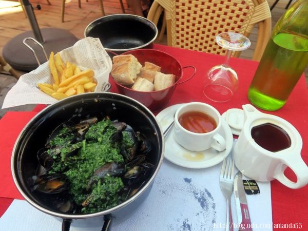 位於科西嘉島西南海岸的阿雅丘(Ajaccio)是一座漂亮又熱鬧的港口城市,沿著巷弄一路走來經過教堂、博物館,港口對面的Avenue Antoine Serafini是一條漂亮的大道,馬路中央設有綠地、棕櫚樹與Place Foch噴水池,噴水池中央的雕像是拿破倫(Napoleon Bonaparte 1769~1821) 。大道的旁邊整排都是餐廳,我挑選雅致的Taverne Napoleon Ajaccio的餐廳用餐,餐點目錄全是法文,服務生央求路過的一位黑人女孩幫我翻譯後,我點了一道淡菜(Mussel)和一壺熱茶,一大鍋的淡菜(Mussel)配了麵包與炸薯條,每樣菜都十分美味,我把整鍋的淡菜(Mussel)和馬鈴薯全吃完,這一餐花費15.5歐元。