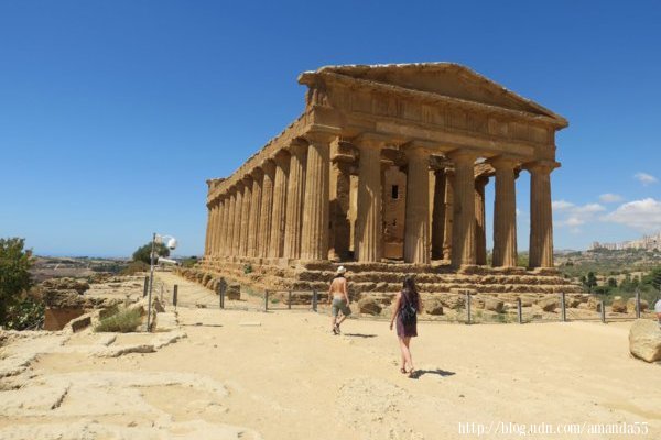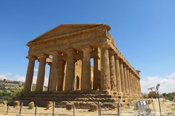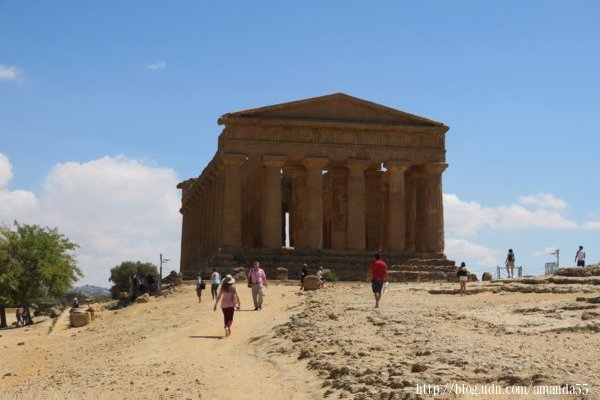 興建於公元前440年的康科迪亞神殿(Templio della Concordia),前後各有6根多立克石柱,兩旁各有13根多立克石柱,這是神殿谷中保存最好的神殿,公元597年被改為基督教的聖殿,羅馬時代的廣場遺址也出現於神殿谷中,還有不少壁龕式的墳墓出現於城牆。