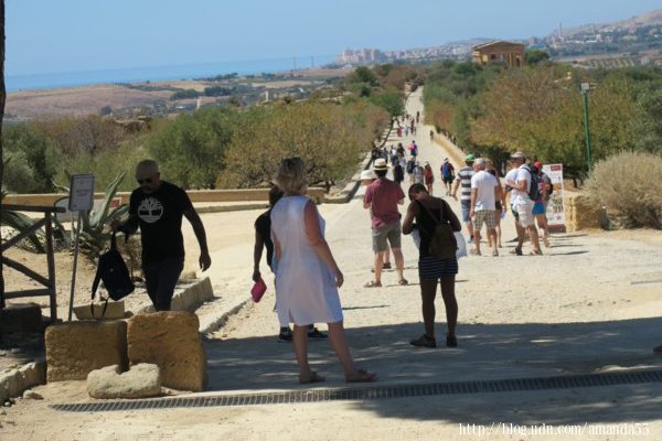 (2017/9/6)從巴勒摩可搭火車到阿格里真托,兩地的距離122公里,車資9歐元,一個半鐘頭抵達阿格里真托火車站,再搭公車往郊外的神殿谷(步行約40分鐘), 公車停在神殿谷之西的售票處附近,我跟著人群走,看到排隊的長龍,不用問就知道要在這裡排隊買票,半個鐘頭後買到票,費用10歐元。