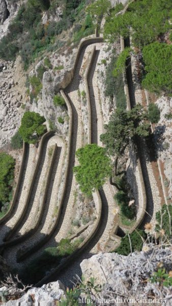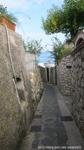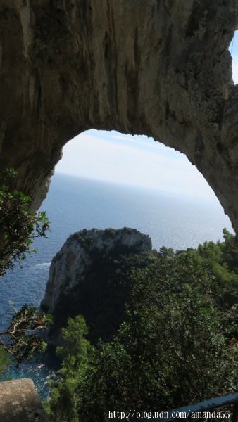 街道旁經常出現景點的指示圖,我朝著天然拱門 (Arco Naturale)的方向邁進,這條穿越社區的步道坡度不大,沒有岔路走起來相當輕鬆,沿途有不少的遊客,接近海岸時往山坡上走,幾次峰迴路轉後,已經來到懸崖邊,天然拱門 (Arco Naturale)是一座被海水侵蝕成窗洞似的巨岩,景觀十分的奇特。 走向下山的步道回到港口,17點渡輪準時開船,50分鐘後回到拿坡里的碼頭。