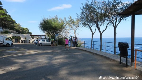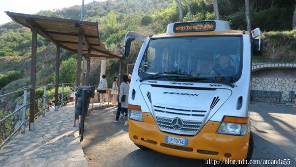 碼頭對面有纜車到市中心,我覺得距離不遠所以決定徒步走到市中心,15分鐘後抵達市中心,搭一號公車往藍洞(Grotta Azzurra),這段山路沒有路肩,只有狹窄的兩線車道,約10分鐘後抵達Internet Point的公車站,司機通知我下車,再搭上另一輛往藍洞的公車,又得支付2歐元的車票,10多分鐘的車程抵達卡布里島西北海岸的藍洞,卻因為海浪超過安全界線,所有的船隻都不營業,就這樣空跑了一趟。