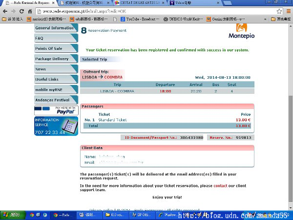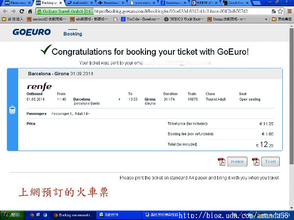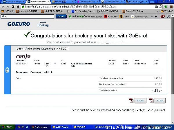 在google的網路搜尋中,我找到了許多提供便宜機票之網站,全程所有的機票我都透過eDreams 來預訂,因為它搜尋的效率既快又一目了然;半個月前我正規劃2015年的波羅的海自助行,發現台灣的FUN TIME機票比價網也能買到便宜的機票。至於火車票與長途巴士車票,葡萄牙部分透過Rede expressos客運公司的網站來搜尋,西班牙部分則從Go Euro的查詢中預訂,可說是很有效率的一個交通資訊網站,出發前這些預訂作業都已完成。