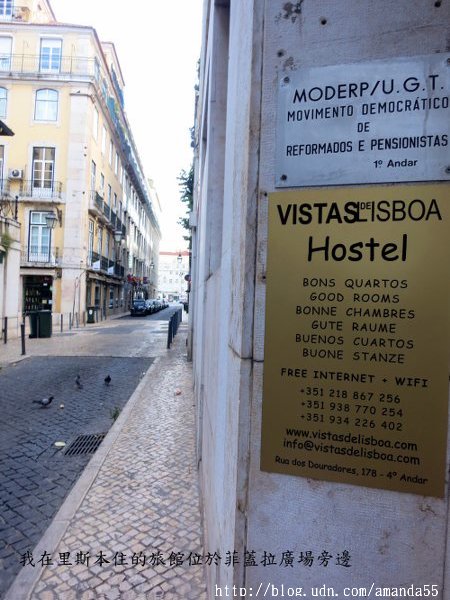 我所投宿的旅館都是透過Booing.com或Hotel.com來預定,Booing.com預定的旅館大都不會馬上要求付款,它的特色是預訂後在允許的期間內可以更改日期或取消,若萬一遇到需要調整行程時有很大的方便性,所以我偏愛在Booing.com中搜尋旅館資訊;里斯本的三晚我住在市中心的菲蓋拉廣場南面的巷道中的Vistas de Lisboa Hostel,它供應的是宿舍型的床位,包括早餐一晚住宿費€15,這是里斯本市中心最便宜的價位,我的觀念是旅館只要能睡覺與洗澡就好,但一定要在市中心,這家旅館剛好符合我的要求,旅館的空間不大,共用的衛浴設備還算乾淨。投宿在這裡的都是來自世界各國的背包客,第二晚竟然所有床位都客滿,向隅的旅客向旅館老闆要求讓他們在客廳打地鋪。