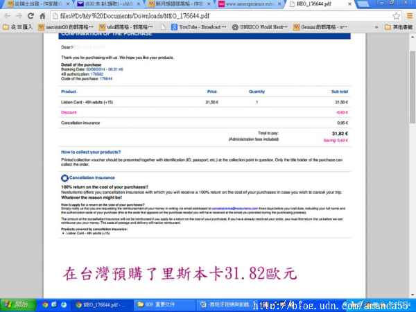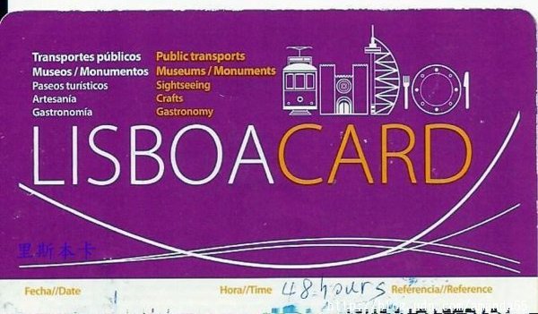 從台灣到里斯本搭乘四趟飛機,晚上8點多抵達里斯本(Lisboa)機場,也沒有檢查護照的關卡就這樣晃出了機場(持台灣護照到歐盟國家都免簽證了),在機場大廳拿出事前預約里斯本卡的單據到服務台領取里斯本卡,我買的是兩天48小時的Lisboa Card €31.82,這是里斯本自助旅遊必買的一張卡,Lisboa Card有三種,分別為24、48和72小時,憑著這張卡可免費搭乘里斯本往郊區的火車或市內公共交通工具,有些景點的門票可完全免費或打折優惠 (所有的資訊都在所贈送的小冊子內,這是很實用的觀光指南)。
