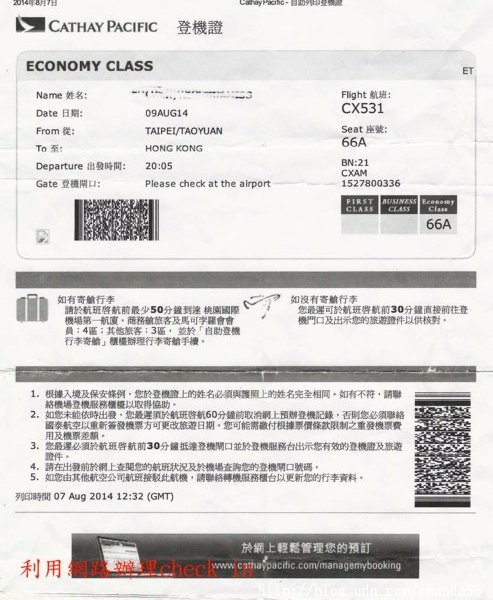出國前一天我上網完成check in之手續(起飛前30小時開放上網check in),原以為可以搶先劃到我喜歡的靠窗位置,沒想到法航的艙位全鎖住,我的座位已經被航空公司安排好了所以幾乎無從選擇 (到了香港法航櫃台我要求換位置還蠻容易達成);這次一切從簡,我只帶了一個背包出國,也不用再到航空公司櫃台托運行李,節省了很多時間。
