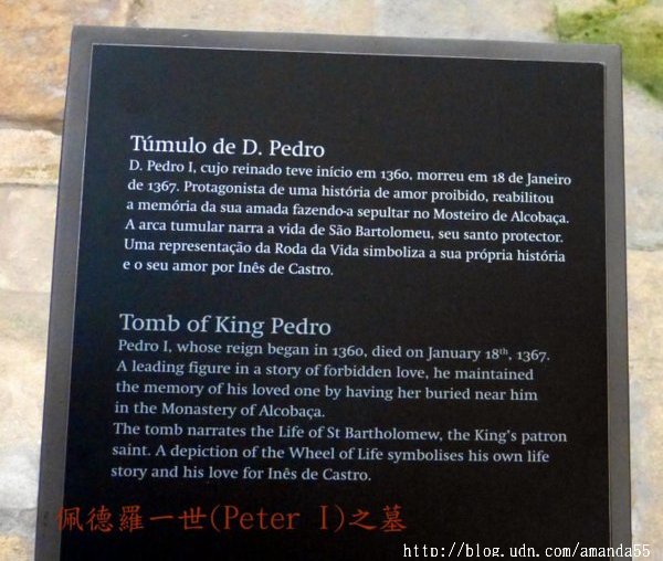 這段典故得回溯到佩德羅年輕時,王子奉了父王之命娶了卡斯提亞的公主,但他所中意的卻是公主之侍女茵內斯,於是王子將茵內斯安置在康布拉(Coimbra)另築兩人的愛巢。這件婚外情不容於王室,1355年佩德羅的父親趁王子不在的時候,派三個殺手將茵內斯暗殺,王子曾為這件事與父王翻臉並起兵造反,後來經過母后調解才平息這段風波,佩德羅即位後在布拉干薩(Braganca)為他與已逝的茵內斯舉行婚禮,變成一具骷髏的茵內斯穿著結婚禮服,國王為她戴上皇冠,這段充滿戲劇性的軼聞成為世人津津樂道的話題。