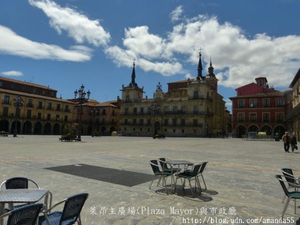 轉向南邊來到了萊昂主廣場(Plaza Mayor),矗立於廣場北邊的市政廳建於1730年左右,周圍的一座座長廊使廣場的規模更加雄偉,與其他廣場一樣,這裡是集會或舉辦各種藝文活動的場所,假日就變成了市集廣場了。轉向西邊的廣場,1891年高地(Antoni Gudi)所設計的著名建築物波提內斯之家(Casa de Botines)座落在此,高地坐在椅子上的銅像也成為熱門地標,這座建築物是一位紡織業大亨Carlos Guell委託高地所設計的住宅及商業大樓,現在已變成一家銀行的辦公室,這座如同中世紀城堡模樣的建築物在1969年被列入紀念館。