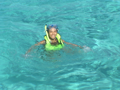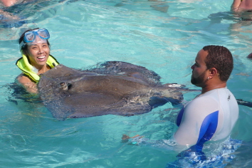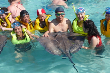 快艇一路乘風破浪的往Stingray City 挺進,很快的就到達浮潛的地點,每個人都必須穿上救生衣才可以下水。在下水前,浮潛教練示範了浮潛面罩的使用方法後,大家就迫不及待的紛紛投入加勒比海的懷抱中,盡情的享受浮潛的樂趣。