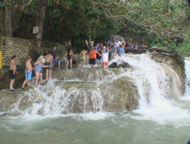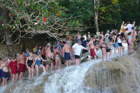 等一切就緒,重頭戲就要上場了。一到Dunn’s River Falls,一些動作快的 Group已經下水,到處充斥著此起彼落的驚叫聲、笑聲、與歌聲,實在有夠熱鬧。但放眼望去清一色皆是西洋人的面孔,我們這一團是唯一的東方人。