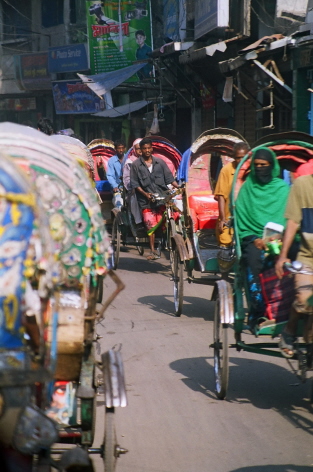 從機場出來,還未進入市區,就開始一路塞,如此走走停停的將進兩個鐘頭才進入市區。越接進市中心,交通狀況越加混亂。只見人潮洶湧,每個十字路口都被無所不在的 Richshaws ( 達卡特有的人力車 )所塞爆,人潮車潮擠爆了整條馬路,那種盛況,不是親身經歷是無法想像有多壯觀。什麼是人滿為患,只要在達卡待過的人,就不難心領神會了。