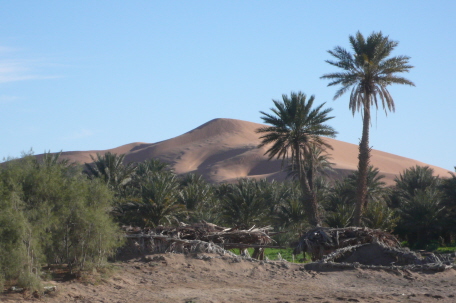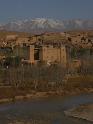 從車窗往外望,遠方聳立著是白雪皚皚的Atlas Mountains,而近處卻是一片荒漠景象,偶爾會出現一片長滿椰棗樹的綠洲,雪山配上沙漠綠洲,立刻形成了強烈的對比,這景觀實在太搶眼了,可說是趣味性十足;走訪了那麼多的國家,在我的記憶中,未曾出現過如此奇景。這是上帝的傑作,我們何其有幸,能目賭到如此奇特的自然景觀,可算是摩洛哥之行的最大收穫了。