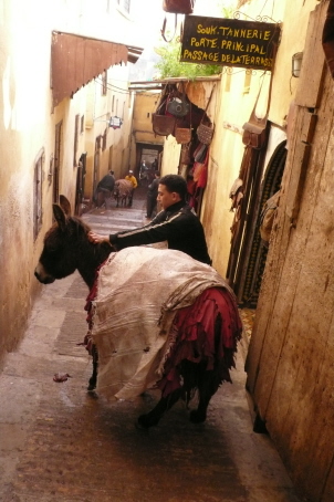 在參觀完了皇宮後,我們就轉往舊城區,進入風門後,一段徒步之旅就要開始了。導遊告訴我們這是個像迷宮式的巷道,極容易走失,大家可要跟緊一點,不要落單。如果聽到 "balabala"的吆喝聲響自後方,那就是有驢子或推板車的請行人讓路,大家就要趕快閃到一邊,以免被驢子撞個正著。