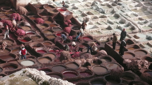 最後來到皮革染坊,登上了皮革商家的頂樓,居高臨下的視野讓我們一覽無遺的觀看染坊的作業過程。上百個染缸構成了壯觀又獨特的畫面,好像一個超大的調色盤似的;染坊工人在現場正忙碌的進行著各項染整的工作,整幅畫面就好像正在觀賞一齣默劇般的感覺,這個染坊已成為Fes的經典畫面,出現在旅遊書籍和明信片中了。