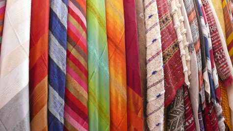 再往前走,馬上被那五彩繽紛的牆面所吸引,那是由一條條圍巾所組成的拼圖,實在是別具巧思。迎面來了一輛小板車,裡面卻是坐著一位老太太,真是好玩。一路上,不時的聽到balabala聲,人與小驢兒爭道之畫面,大概只存在Fes 這座古城了,可算是別無僅有的經典畫面了。