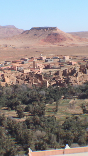 不知不覺中,一片美麗的綠洲谷地已出現在山腳下,這是摩洛哥一個十分有名的峽谷地--Tinerhir,在這片綠洲上,形成了一個頗為壯觀的村落,密密麻麻的傳統建築就像積木似的聚集在椰棗林後;更遠處則聳立著綿延不斷的巨大岩壁,在那奇形怪狀的岩壁的襯托下,整個景觀就更加獨特了。