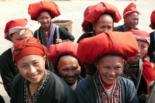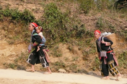 在Sapa 郊區的這個紅苗族村落,規模還不算小,這些紅苗族婦女,只要看到觀光客一到,馬上全程緊迫釘人的一路糾纏,就是硬要推銷他們的手工藝品。若不小心被請入店裡的話,得耐心的看他們一件件的把所有的東西都展示一遍才得脫身。所以我們就只好在唯一的一條街上逛一逛,再到村子的入口處拍照,因為幾乎等著做生意的紅苗族婦女都聚集在這裡,所以可以捕捉到許多精采的畫面。