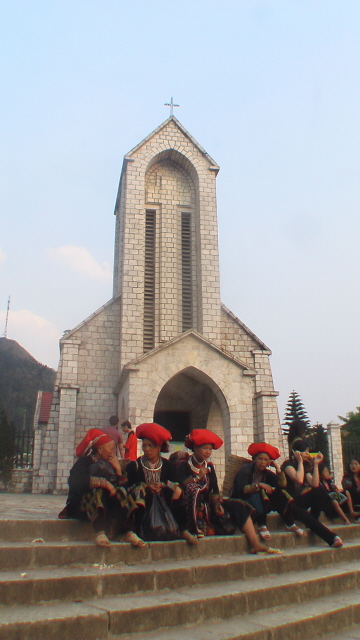 逛完了市集,我們就轉往市中心,走到P Cau May的盡頭,就是熱鬧的廣場與公園,廣場上總是聚集了許多的攤販與遊客,就在廣場的對面,有一座法國殖民時期所建的教堂,這座教堂雖然稱不上雄偉,但整體造型頗為典雅。教堂前的廣場與階梯,是觀光客留影的最佳首選,苗族婦女們,常常三五成群的坐在階梯上聊天。這樣的場景,倒成了拍攝教堂時的最佳陪襯。