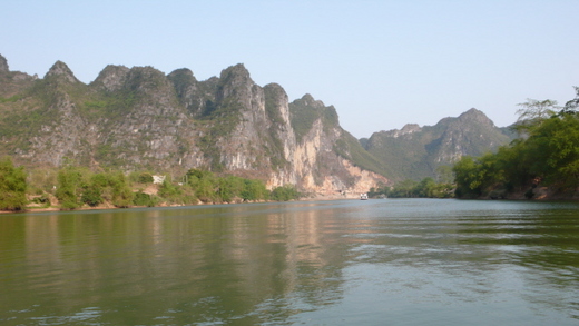 舟行江中,奇峰與峭壁不斷的出現於眼前,可說是舉目所視,盡是渾然天成的美景。 將近2個鐘頭後,峭壁上就不斷的出現一幅幅深紅色的壁畫,據統計資料顯示,到目前為止,在左江岩壁上已發現了80多處的壁畫。