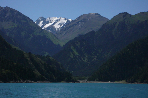 往天池途中,到處可以感受出新疆特有粗獷的山水特色,可說是處處美景了。到了風景區的外圍,吉普車就無法再前進,必須改搭園內的專用車輛;如此一路跋涉,終於在山腳下下車,再步行約十幾分鐘才可抵達天池。天池的海拔將近