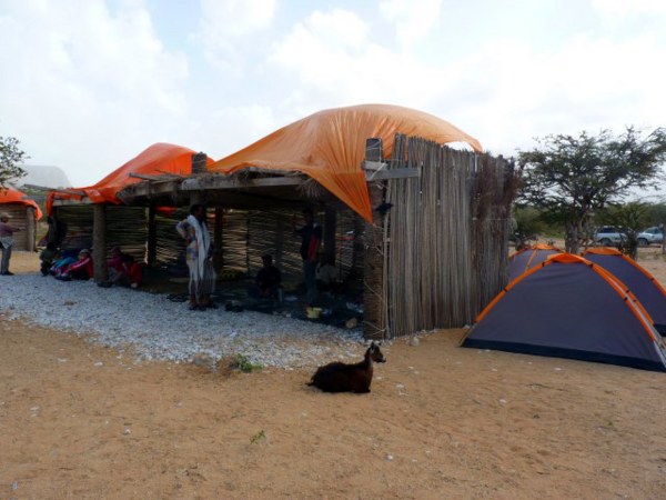 走著走著約一個鐘頭後,不知不覺中已走到沙灘的盡頭,完成了2公里長的沙灘漫步之精采旅程,我們終於抵達了迪特瓦潟湖的保護區了(Detwah Lagoon Protected area) 。脫離了鋪天蓋地似的白沙世界,進入了一小片的綠野中。這裡有一個簡陋的營區,我們將在這裡野餐。