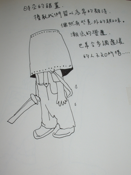W 跟我算是忘年之交吧, 他也喜歡繪圖, 在他眼裡我算是個異類, 他曾說很少我這年紀的女人, 還會畫漫畫寫 blog , 噯 !他心裡一定想我很幼稚吧!他說喜歡畫漫畫的人,通常有顆童心未泯天真的想法....是啊!每次跟他說話時,我會像小女生,因為他很有男人味...