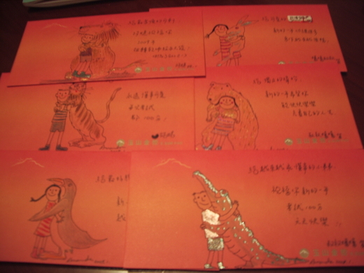 今年老公特別的忙碌, 所以晚一天回婆家, 晚上照舊仍可以回娘家吃飯, 真的好幸福, 大哥弟弟也從外地回來了, 雖然每年的初二都不是我可以準時回娘家的, 但平常可以每個星期六回娘家更棒.......趁今天仍可在家優閒的畫圖時, 突然想何不把準備好的紅包加上圖, 只可惜我沒有創意, 只有幾米風.........