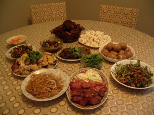 老媽逢年過節一定會作那道我最愛的 < 什錦菜抅芡 > 而大嫂今年的新菜是她學了做豬肝, 味道極佳, 而兒子最愛阿嬤煮的白斬雞, 在還沒開飯前已經享受了阿嬤特別優待 < 雞腿 >, 而我最愛雞翅, 媽咪也是會在切雞肉時, 先塞給我讓我先吃, 而那道抅芡的菜, 她也總是會對我說, 妳喜歡吃熱的, 先吃一碗....