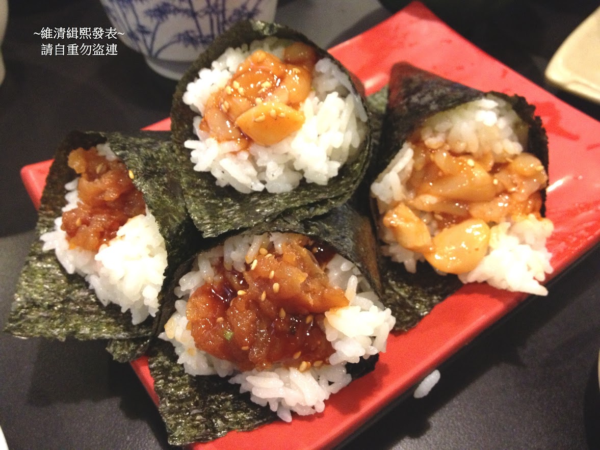 辣鮪魚+辣干貝手卷 只有微微的辣, 有點像是用韓式辣椒醬去調配的.