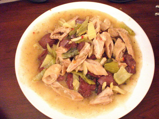 油燒熱後放入大蒜, 辣椒醬爆香, 隨即放入大腸. 拌炒一下後, 放些醬油跟糖. 隨後放酸菜, 放些水. 這時候嚐味道, 酌量加入鹽, 糖, 醬油, 胡椒, 再放入豬血悶煮. 起鍋前放些麻油, 然後再勾芡即可. (噓!! 噓!!! 噓!!! 我知道看倌要說啥!!! 再忍一忍!!!! 我快說完了!!!)