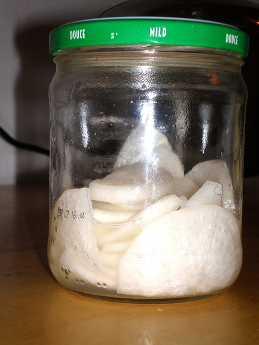 另外介紹一位日本媽媽教的醃蘿蔔, 只是我沒放黃色食用色素. 白蘿蔔切細片, 直接放入鹽跟糖(喜歡吃鹹則多放鹽, 吃甜多放糖), 放入瓶中搖晃均勻, 放一天即可. (如果喜歡紫蘇的味道, 也可將洗乾淨的紫蘇切碎放入一起醃漬.)