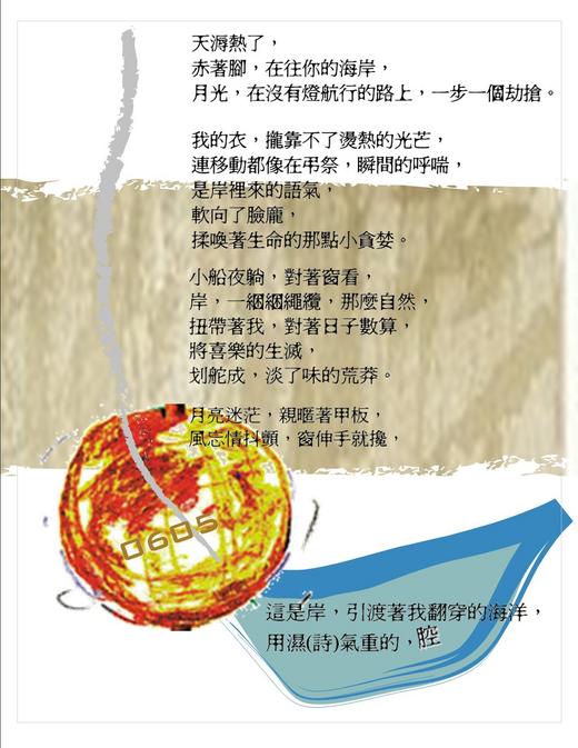 ㄢ尢押韻是格律詩的型態;「天溽熱了/赤著腳/在往你的海岸」是敘述詩的開頭形式,引人好奇;「月光/在沒有航行的路上/一步一個劫搶」是屬於圖象詩的範疇…「將喜樂的生滅/划舵成/淡了味的荒莽」吾人那變了味的浩嘆是屬於妳的懷古。