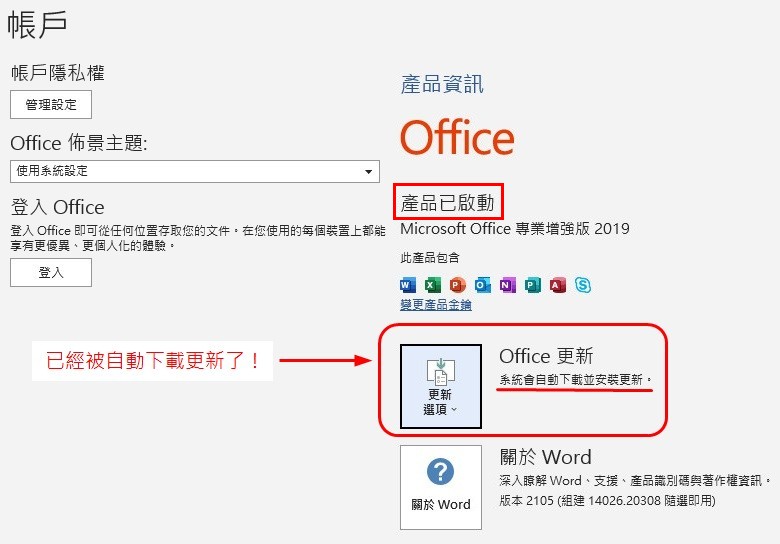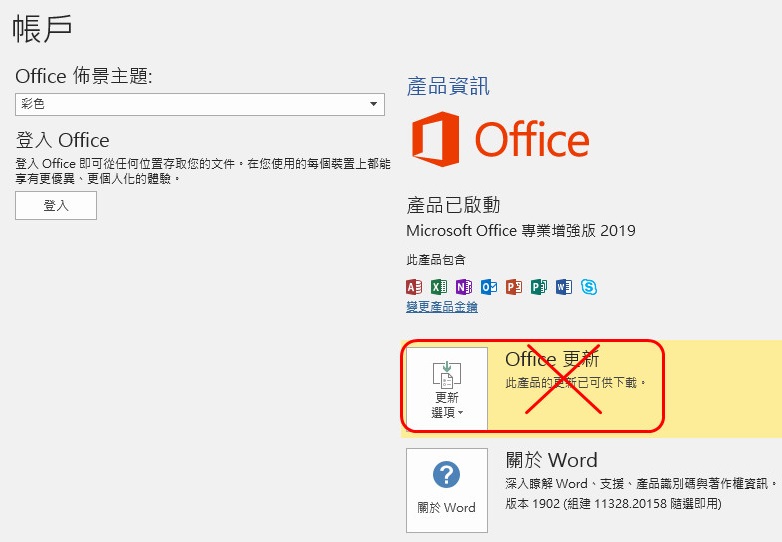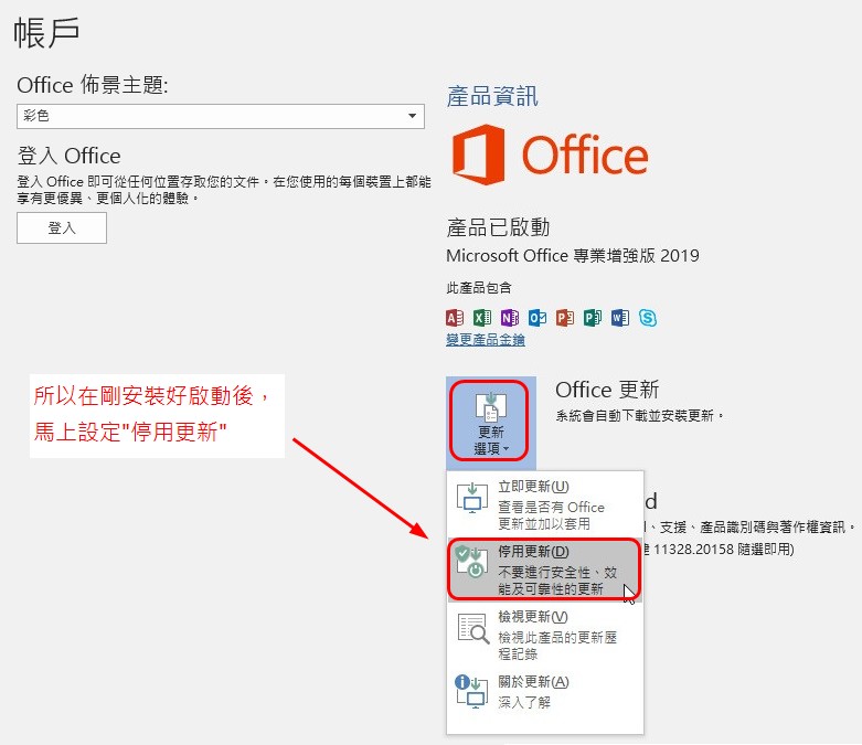 但是, Office 2019安裝好啟動後,記得先設定"停用更新"喔!