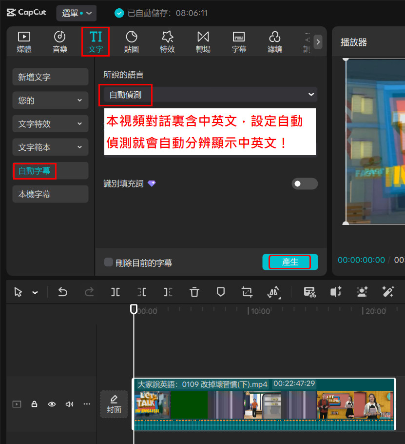 [將CapCut匯出影片的字幕檔=>拉到剪映专业版上影片字幕後匯出加上字幕的影片]