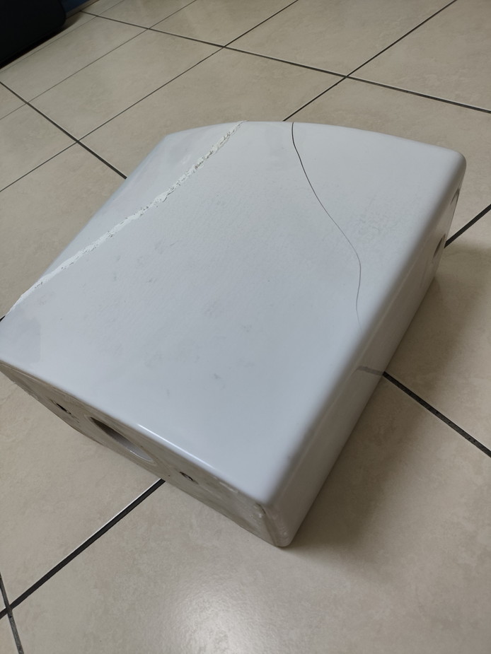 這次陶瓷水箱終於龜裂,應該是受到馬桶蓋掀起時直接碰撞所導致。