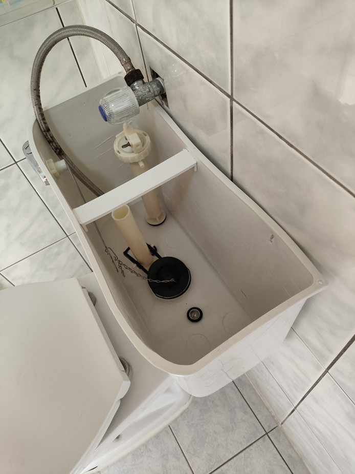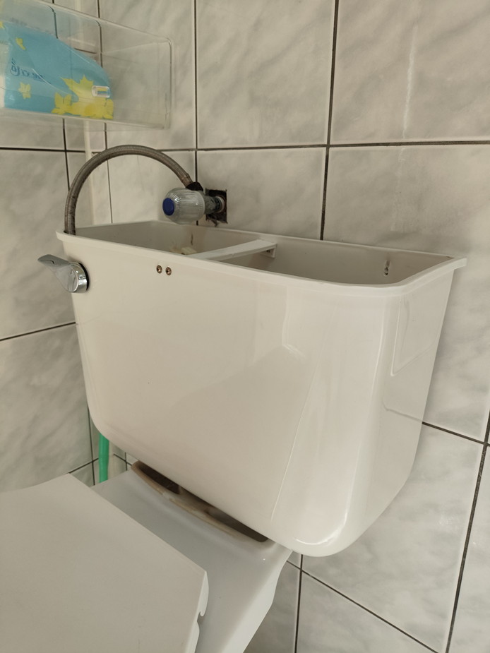7/6星期天依慣例下午清掃屋子拖地板,晚上發現主臥室浴室馬桶漏水,經查是陶瓷水箱龜裂造成漏水,因為主客兩間浴室馬桶都因水箱零件龜裂,經詢原廠報價驚人,於是自己改造為手動供水,水箱蓋也廢棄不用,後來發現陶瓷水箱本體不耐碰撞,原有的水箱蓋比較厚重耐摔,蓋在水箱上,除了美觀也兼具保護水箱本體,可避免被馬桶蓋掀翻時直接遭到碰撞。