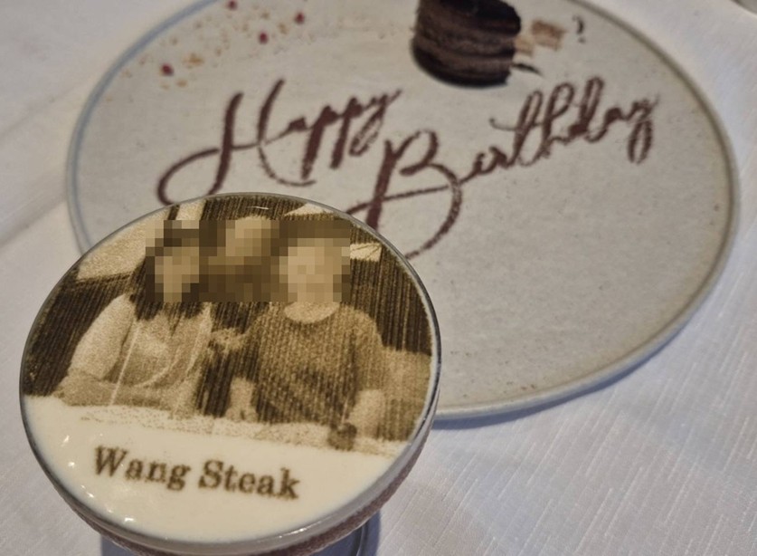 杯子上方是印了「人物合照」的咖啡奶蓋,底部寫著「Wang Steak」,應該是王品集團旗下的王品牛排。
