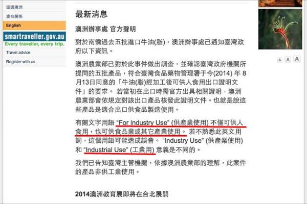 澳洲農業部已對於此事件做出調查,並確認臺灣政府機關所提問的五批產品,符合臺灣食品藥物管理署于今(2014) 年 8月13日同意的「牛油(脂)經加工後可供人食用出口證明文件」的要求。 若當初在出口時需官方出具相關證明,澳洲農業部會依規定對該出口產品核發此證明文件。也就是說這些產品是適合出口供食品製造使用。