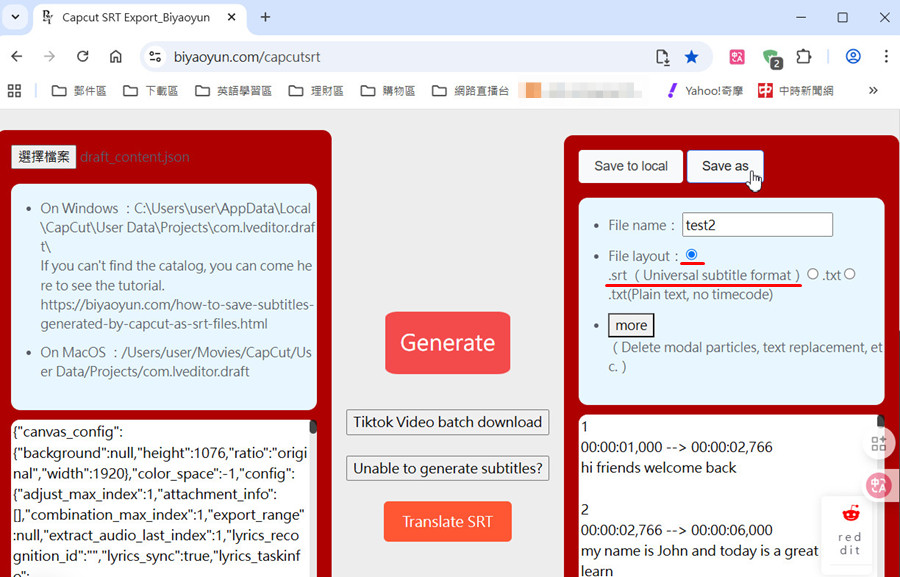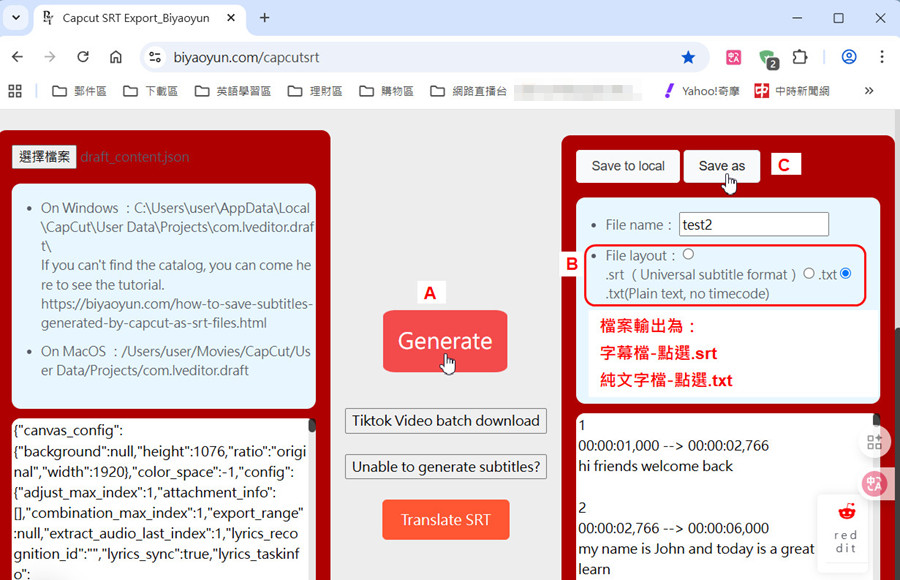 CapCut-影片語音json檔=>字幕srt文字txt檔