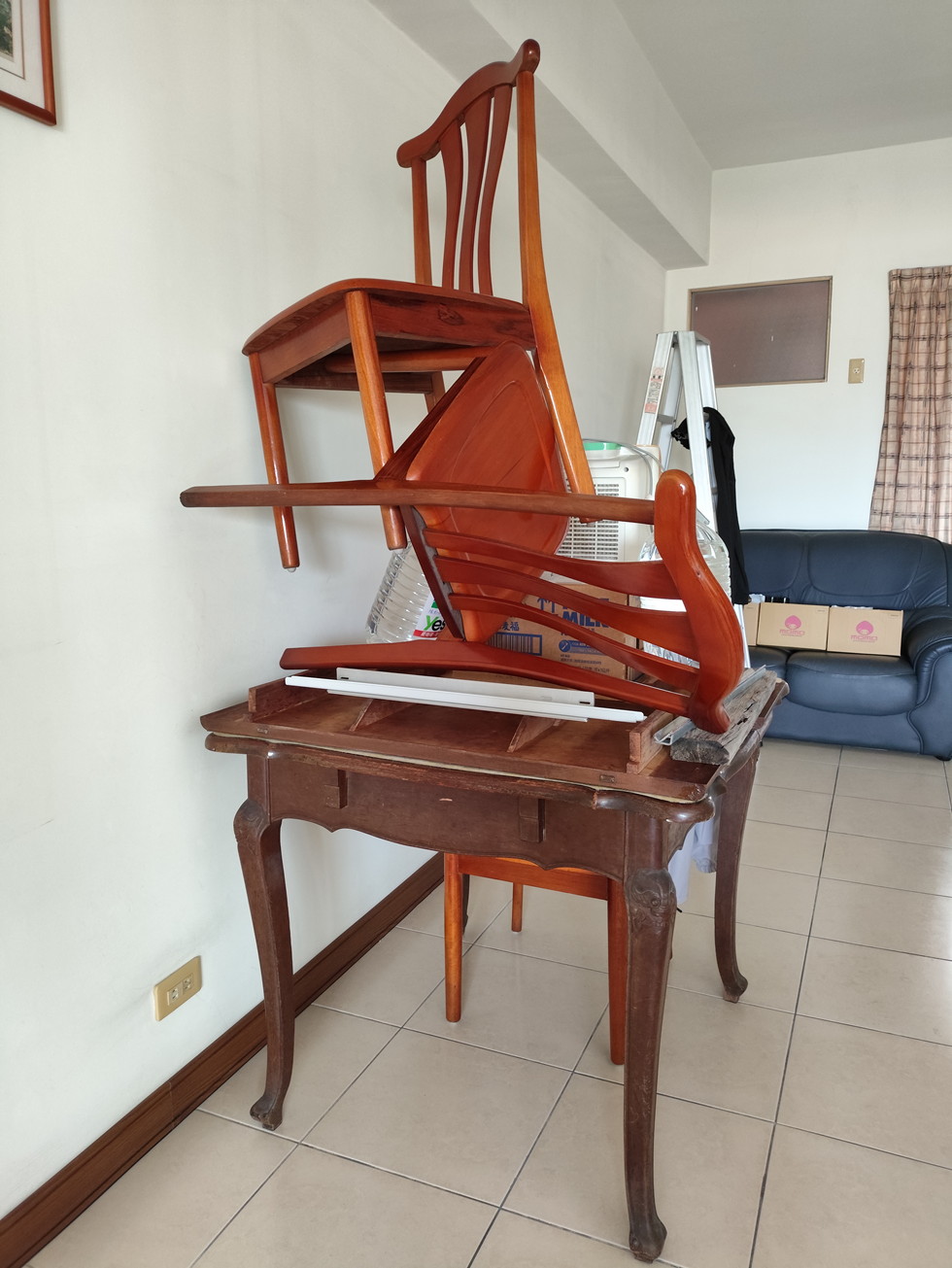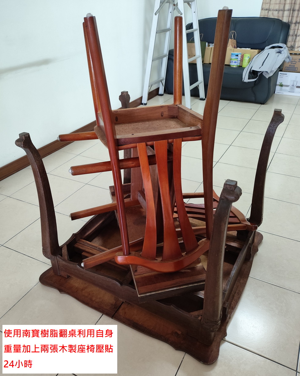 餐桌邊緣年久脫膠上翻,使用南寶樹脂,將整張餐桌倒立,利用本身重量加上兩張木製座椅鎮壓24小時,看來成果還算滿意,惜物可以再戰10年!