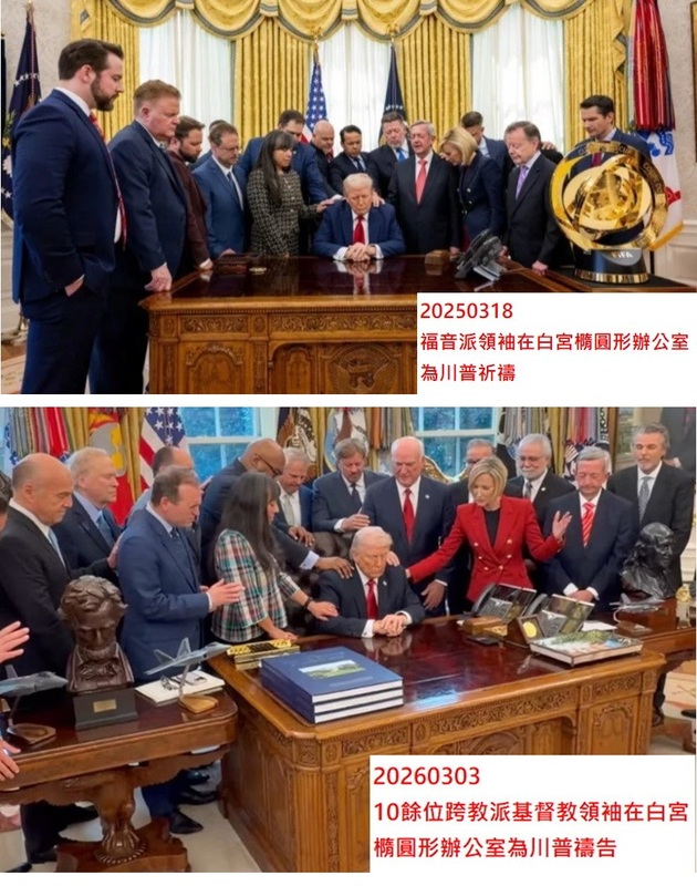 在美國與伊朗局勢緊張之際,白宮在社群媒體發布一段影片,畫面中約有20位來自全美各教派的宗教領袖,聚集在白宮橢圓形辦公室內,圍繞在總統川普身旁,並用手輕按在他身上祈禱。現場不僅為川普祈福,也為美軍及美國國家當前局勢禱告。