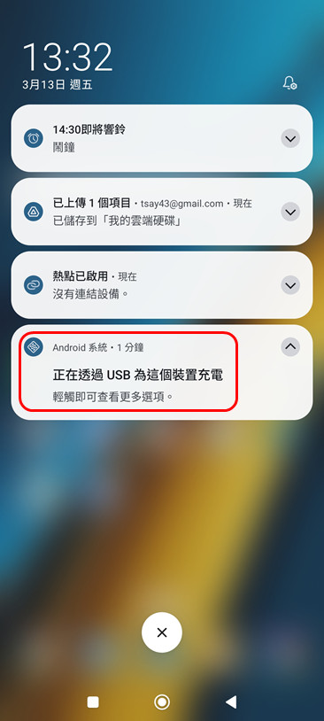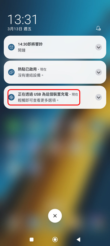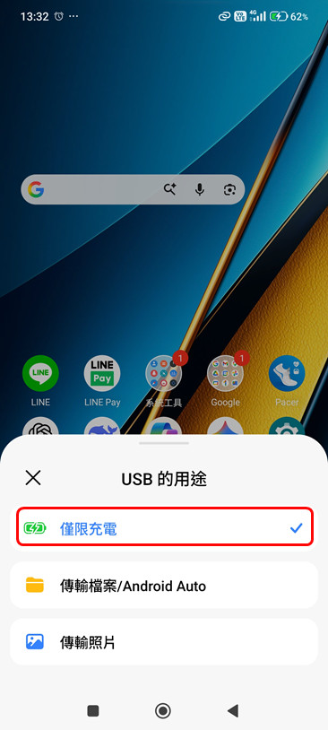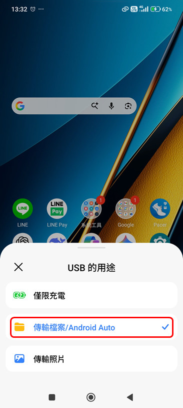 更改 USB 用途: 連線後,下拉手機通知欄,點選 USB 連線通知,將模式從「僅充電」變更為「傳輸檔案 (MTP)」。
