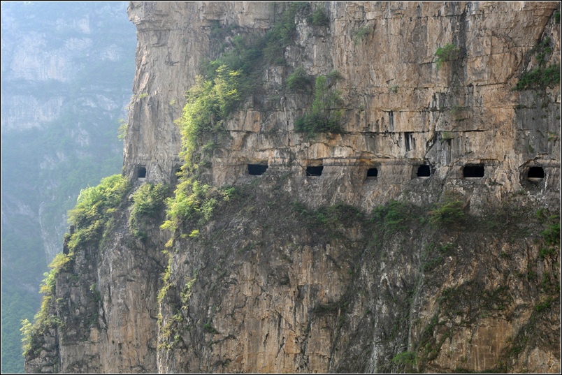 ” 所謂“掛壁公路”,就是在懸崖峭壁上開鑿出來的奇險公路,此類工程奇險、艱難,在中國築路史上都很少見。 山西省長治市平順縣的虹梯關掛壁公路,位於太行山的峭壁之上,道路艱險風光獨特。 這條路的長度約為10公里,在太行絕壁之上連鑿了5個山洞,最上面的洞和最下面的洞落差約有200米,坡度在30度以上。 洞裏的路凹凸不平,迄今仍是砂石路,路況條件奇差,洞內地面石頭尖銳,行駛在此的汽車往往磨損嚴重。