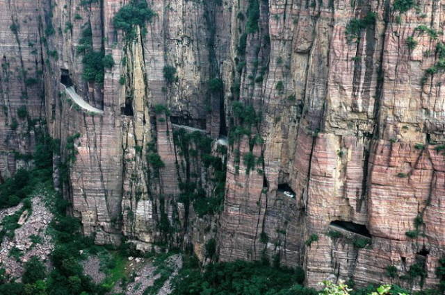 3、郭亮村掛壁公路——絕壁長廊 這條路在“世界最險要十條路”中排第2位,在“全球最奇特18條公路”中排第3位,因修建早又被譽為“太行隧道之父”。 這是在119米高、堅硬無比的紅巖絕壁上,開鑿出的一條高5米、寬4米、長1300米的石洞公路,被稱為“絕壁長廊”。 上世紀70年代,郭亮村村民在村前的絕壁上苦幹5年,修成了這條石洞公路。