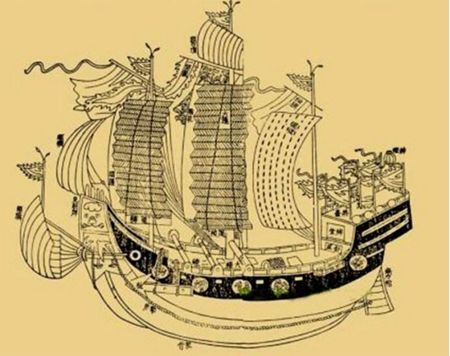 此圖所繪為1850年的中國帆船,此船共有4根桅桿,前2根較高,後2根並排列於船尾尾樓之上,桅桿的布列方式與永樂年間《天妃經》中所描繪的下西洋船只頗為相似。