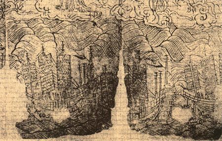 《天妃經》卷首插圖中的船只。《天妃經》全名《太上說天妃救苦靈應經》,刻於明永樂十八年(1420年),是隨鄭和下西洋的僧人勝慧在臨終時命弟子所刻。